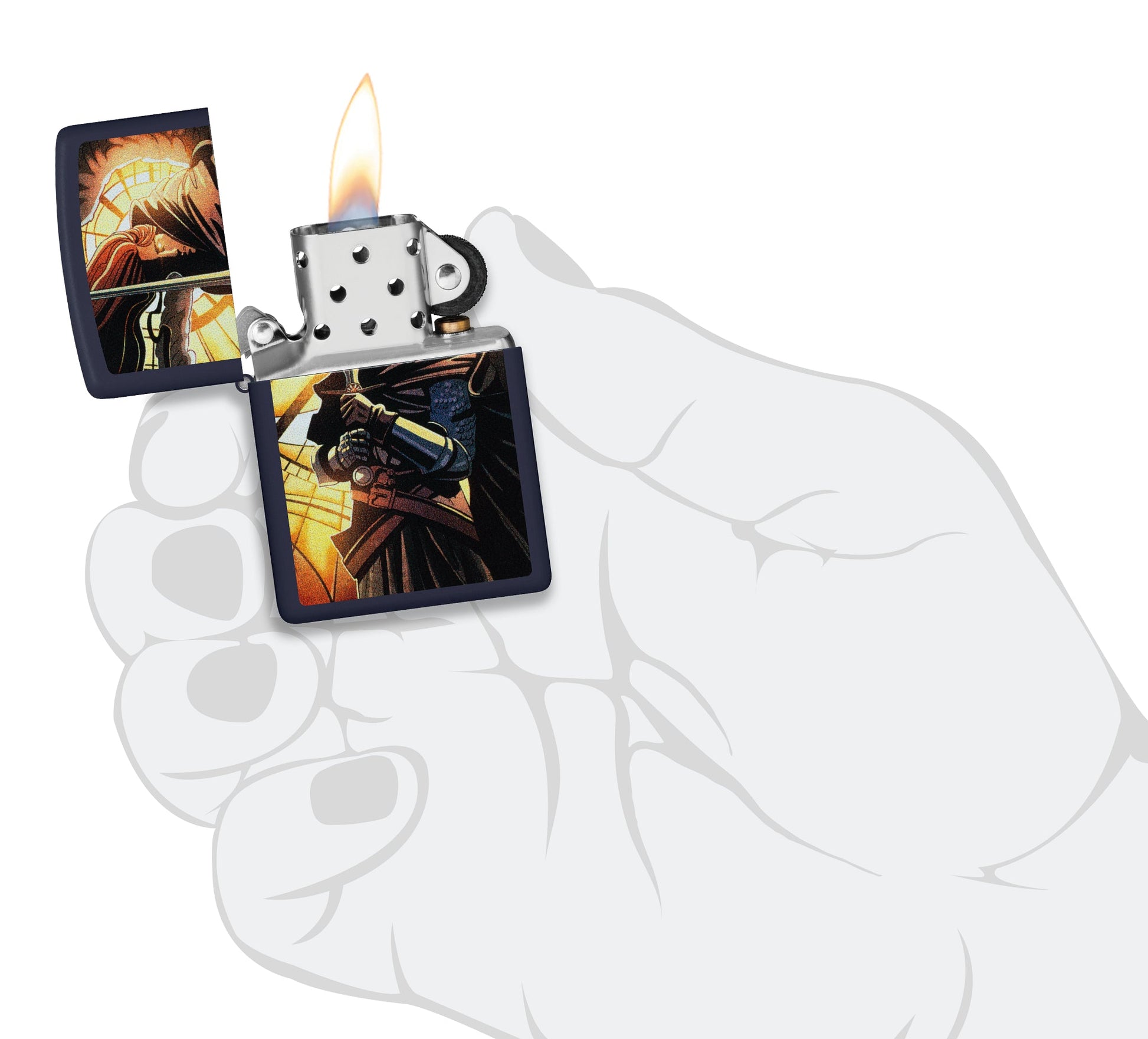 Modern meets medieval with this classic Navy Matte lighter. Backed by glowing light, an armor-clad warrior stands ready for battle in the abstract Color Image design. Comes packaged in a gift box. For optimal performance fill with Zippo lighter fuel.