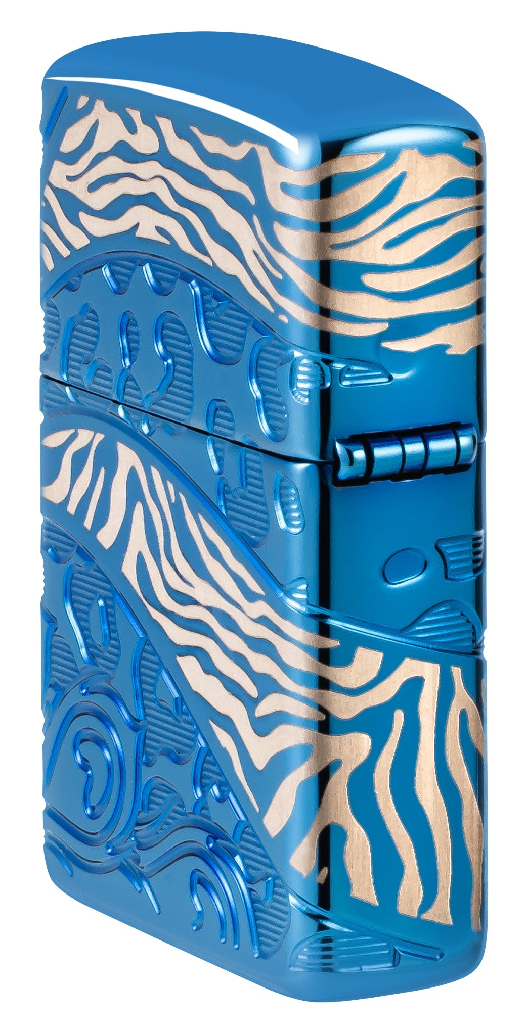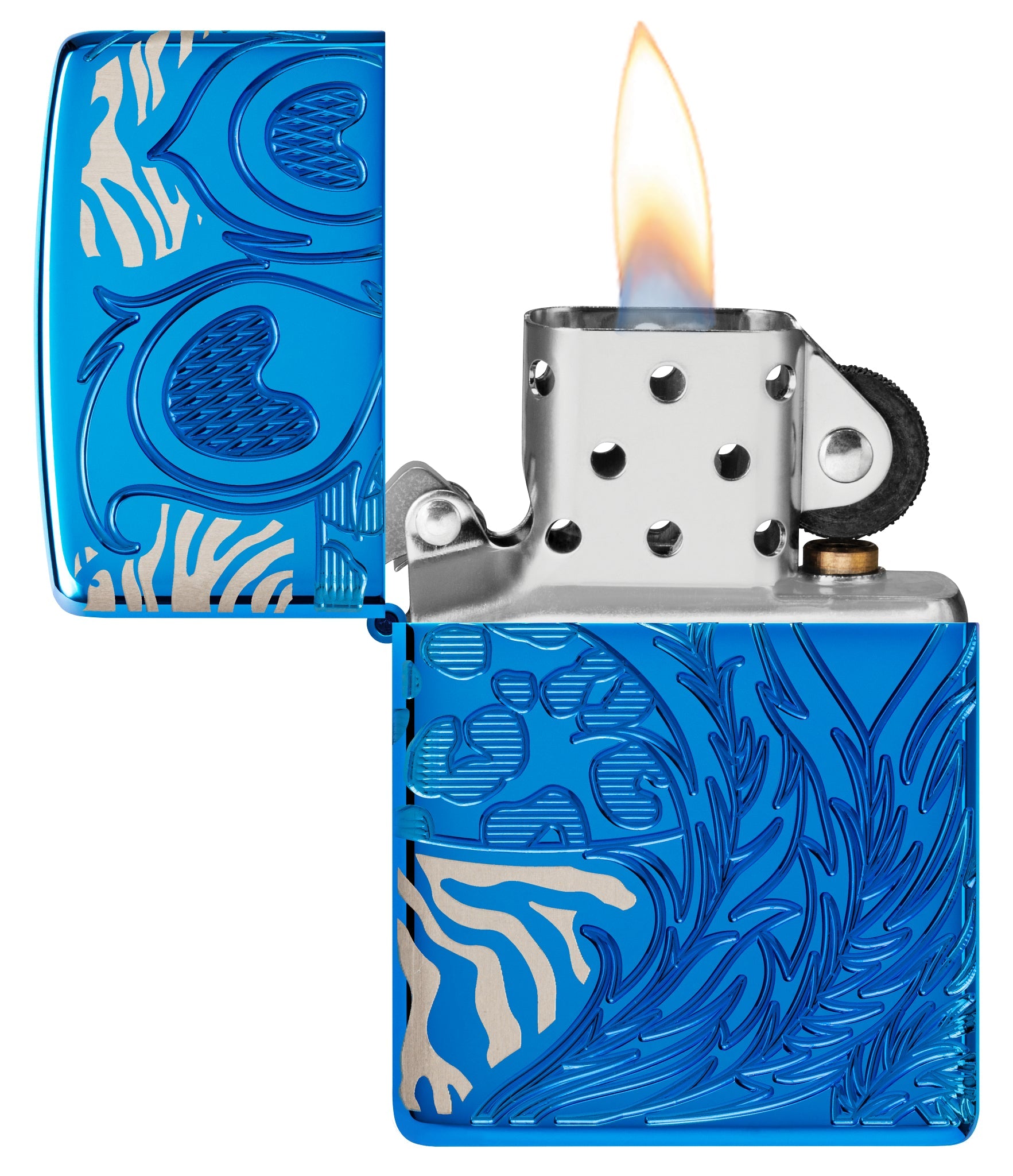 Inspired by the highest fashion of the animal kingdom, spots, stripes and feathers sprawl around every surface of this Armor® High Polish Blue lighter using a combination of MultiCut and Laser 360° engraving. Comes packaged in a gift box. For optimal performance fill with Zippo lighter fuel.