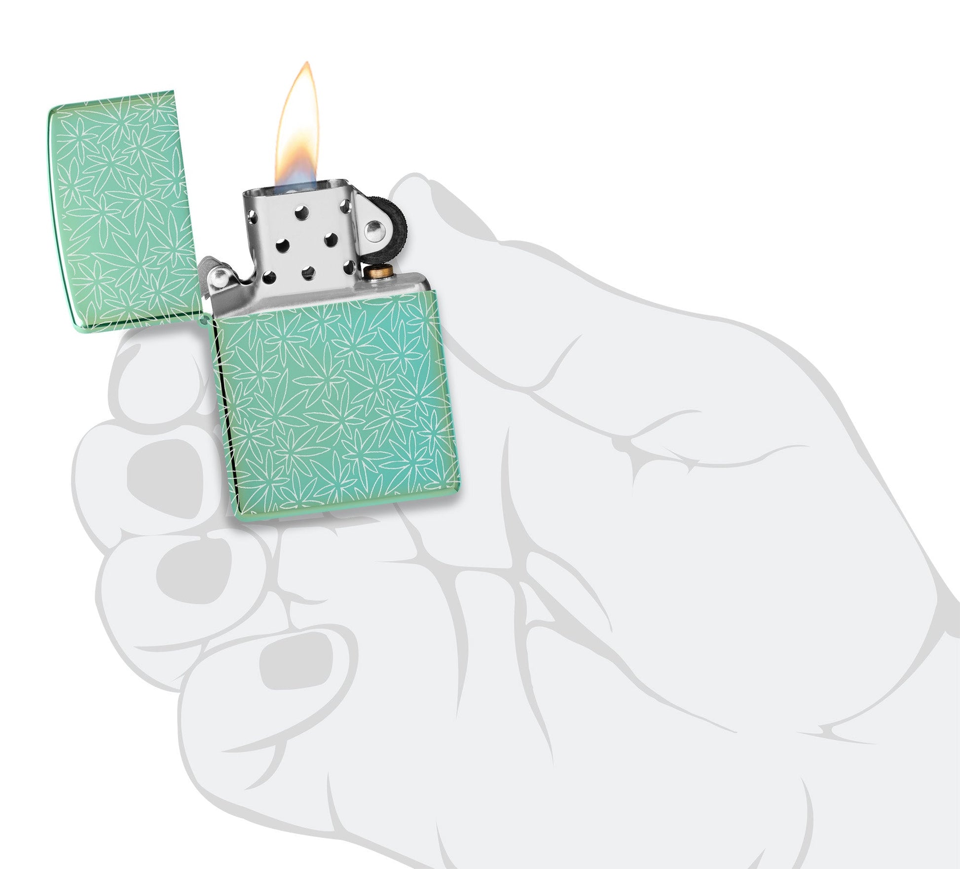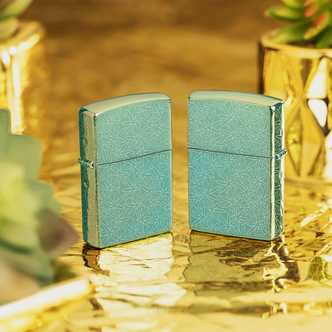 In intricate motif of cannabis leaves covers every surface of this classic High Polish Green lighter in a midcentury-inspired Photo Image 360° design. Comes packaged in a gift box. For optimal performance fill with Zippo lighter fuel.