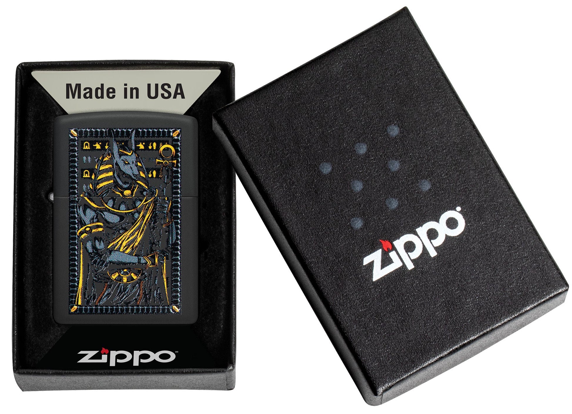 Known as the protector of graves and the afterlife, the Egyptian god Anubis appears on this classic Black Matte lighter in a bold and mysterious Color Image design. Comes packaged in a gift box. For optimal performance fill with Zippo lighter fuel.
