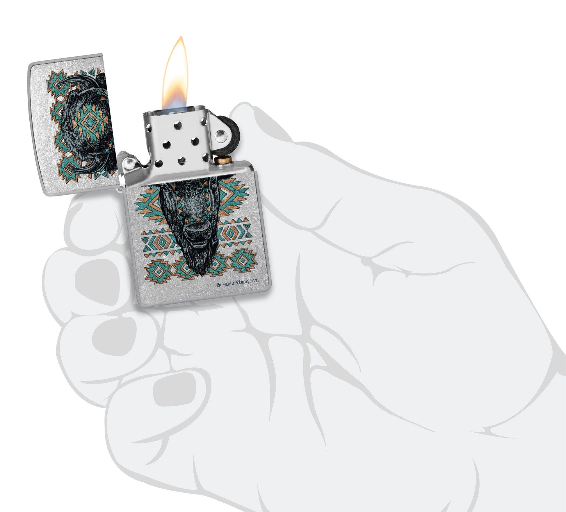 Buck Wear™ is an apparel company that combines pride, patriotism and a love of the outdoors in each of their products. This classic Street Chrome lighter features an American bison head among a vibrant Southwest-inspired motif in an intricate Color Image design. Comes packaged in a gift box. For optimal performance fill with Zippo lighter fuel.