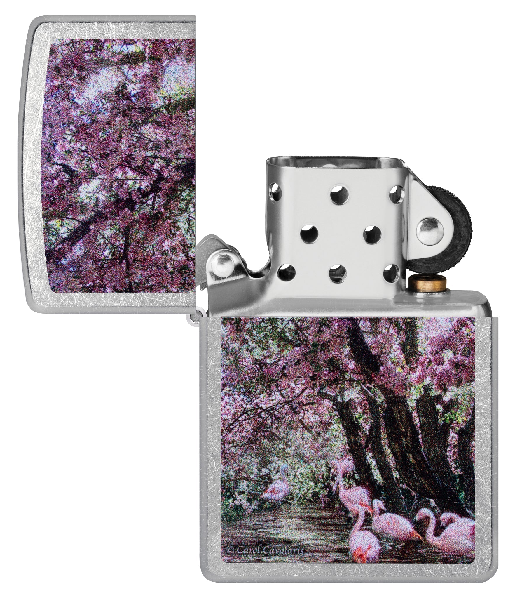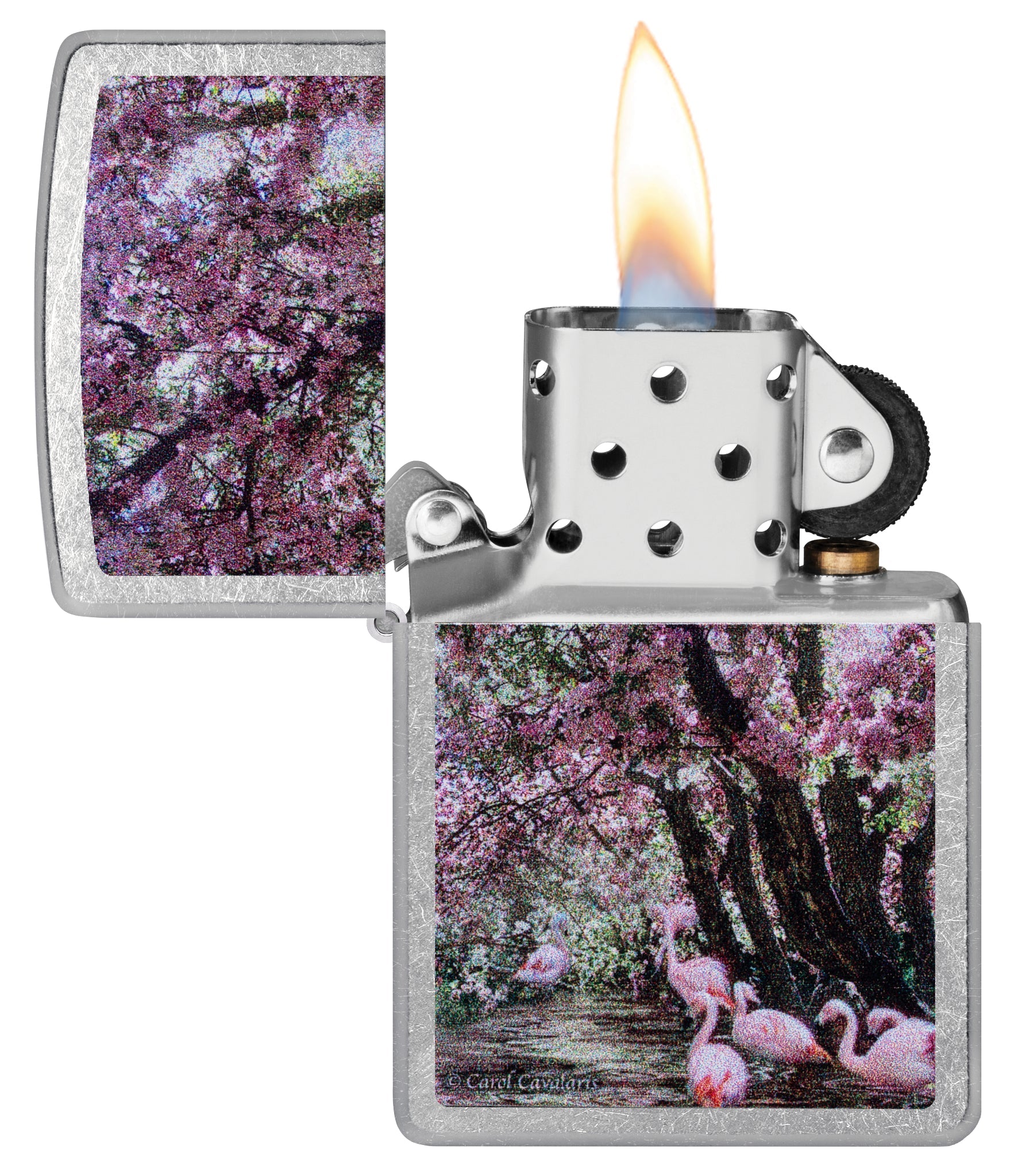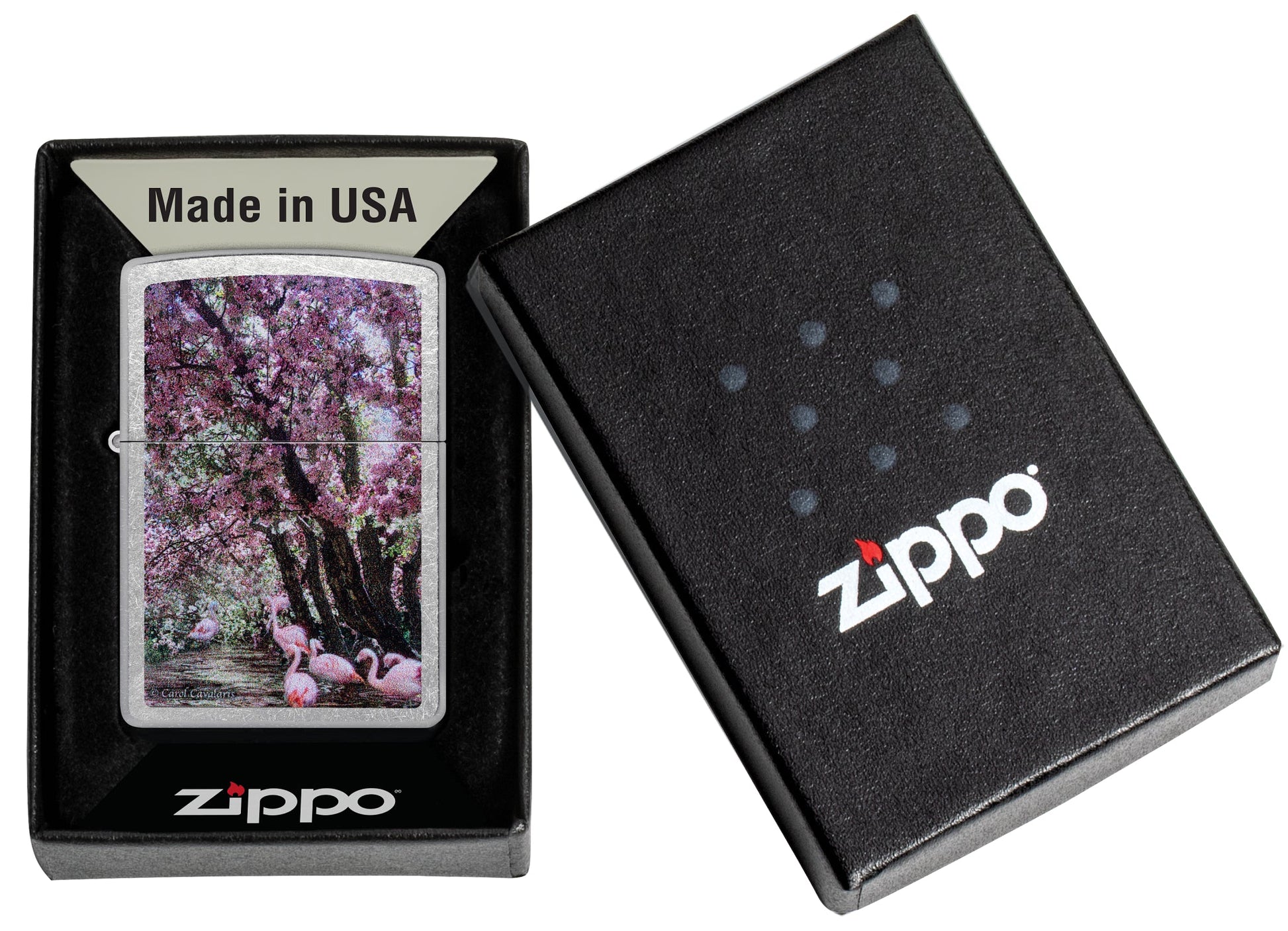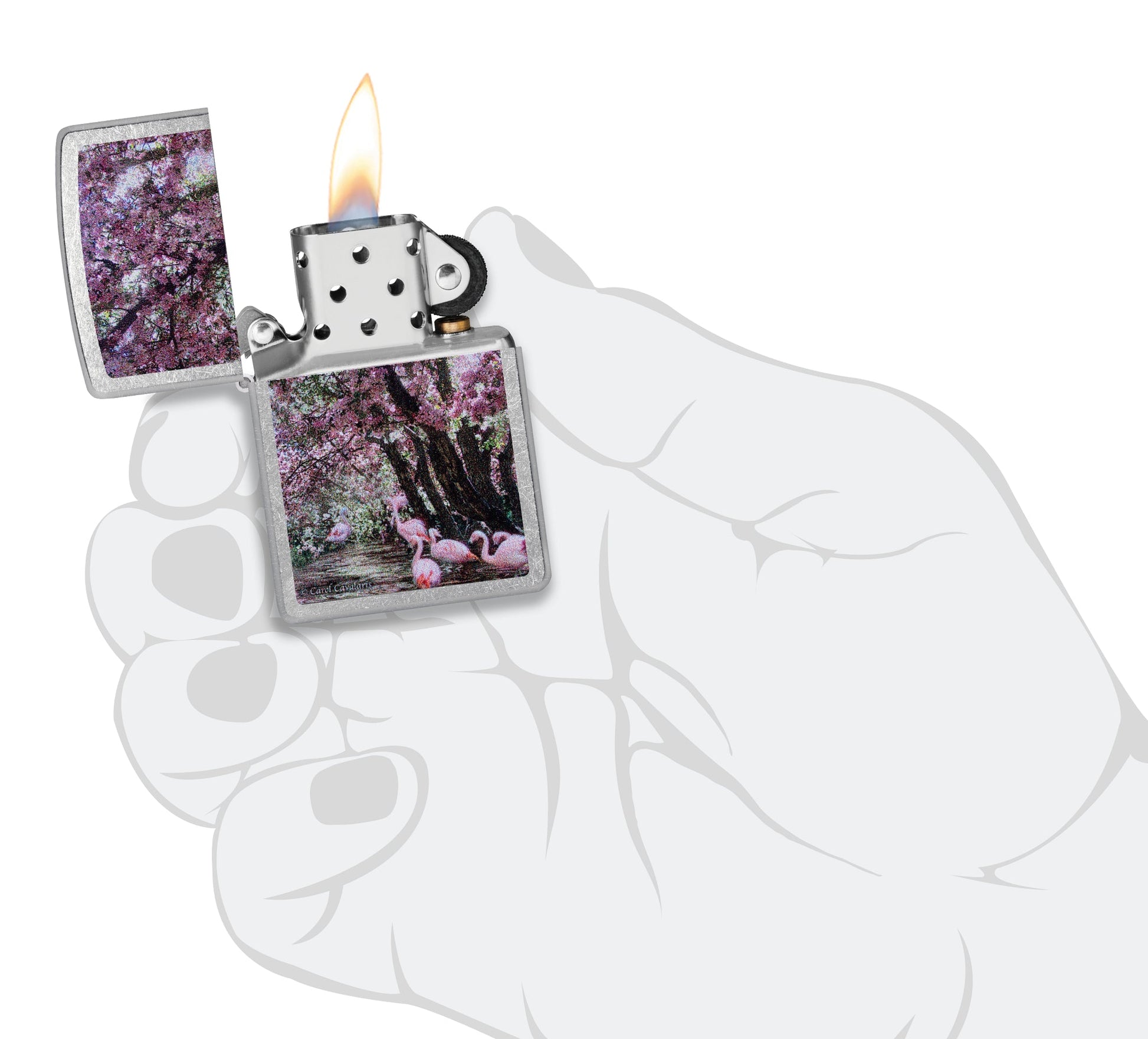Digital and fine artist Carol Cavalaris celebrates the uniqueness of every living being with her extensive, mixed-media body of work. Featuring a flamboyance of flamingos luxuriating under a stunning flowering tree, her piece, Flamingo Lagoon, is replicated on this classic Street Chrome lighter in a serene Color Image design. Comes packaged in a gift box. For optimal performance fill with Zippo lighter fuel.