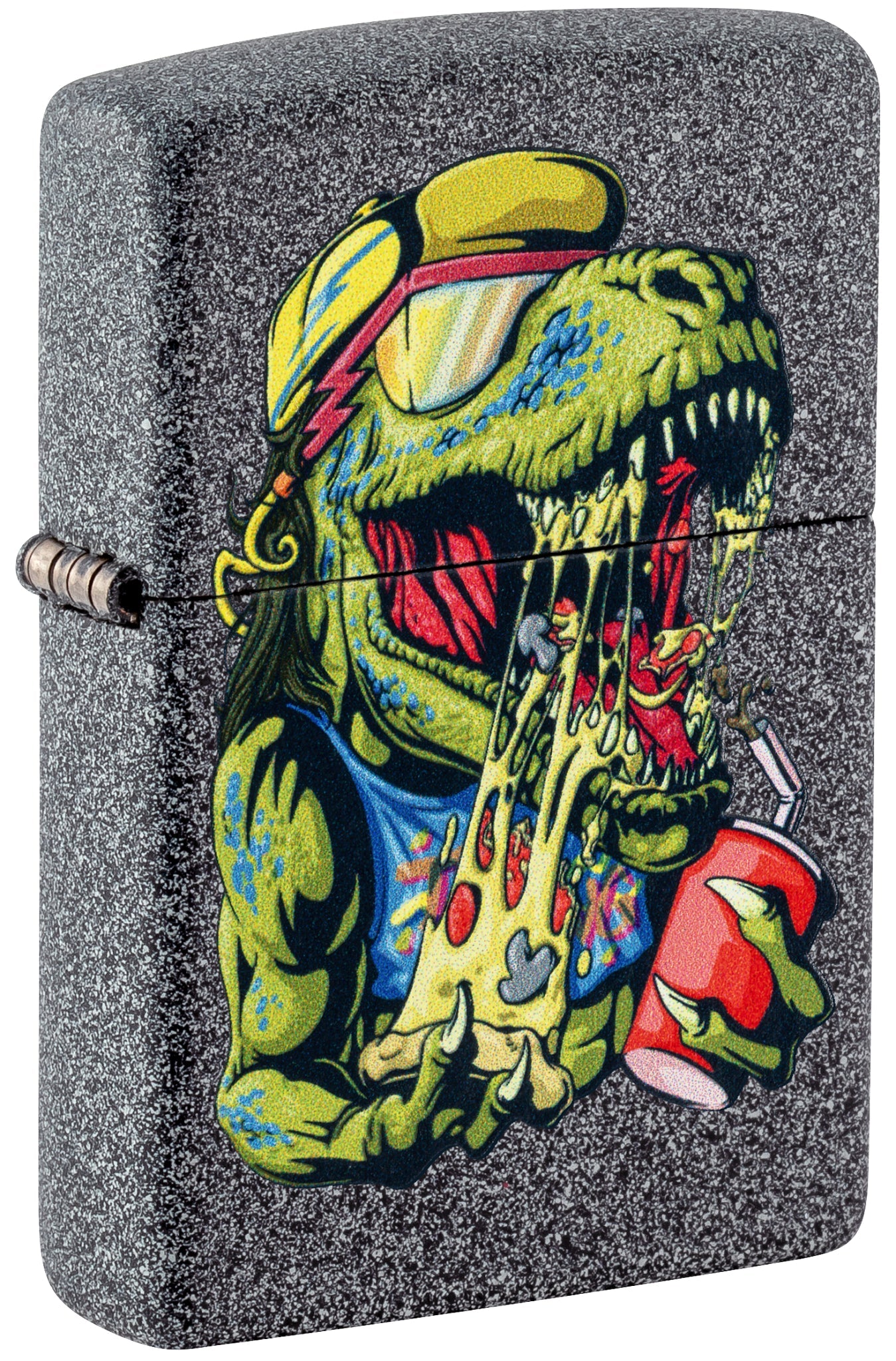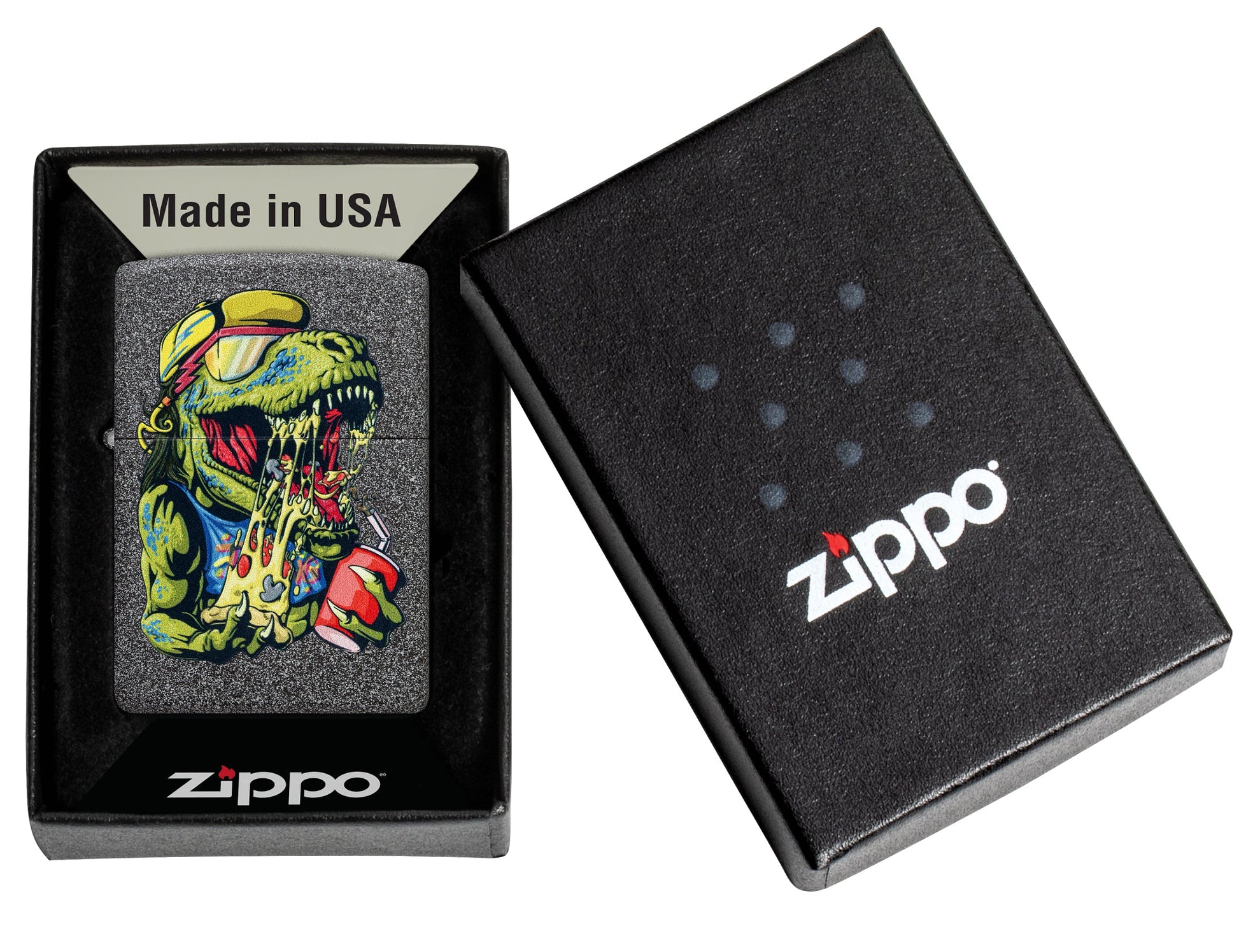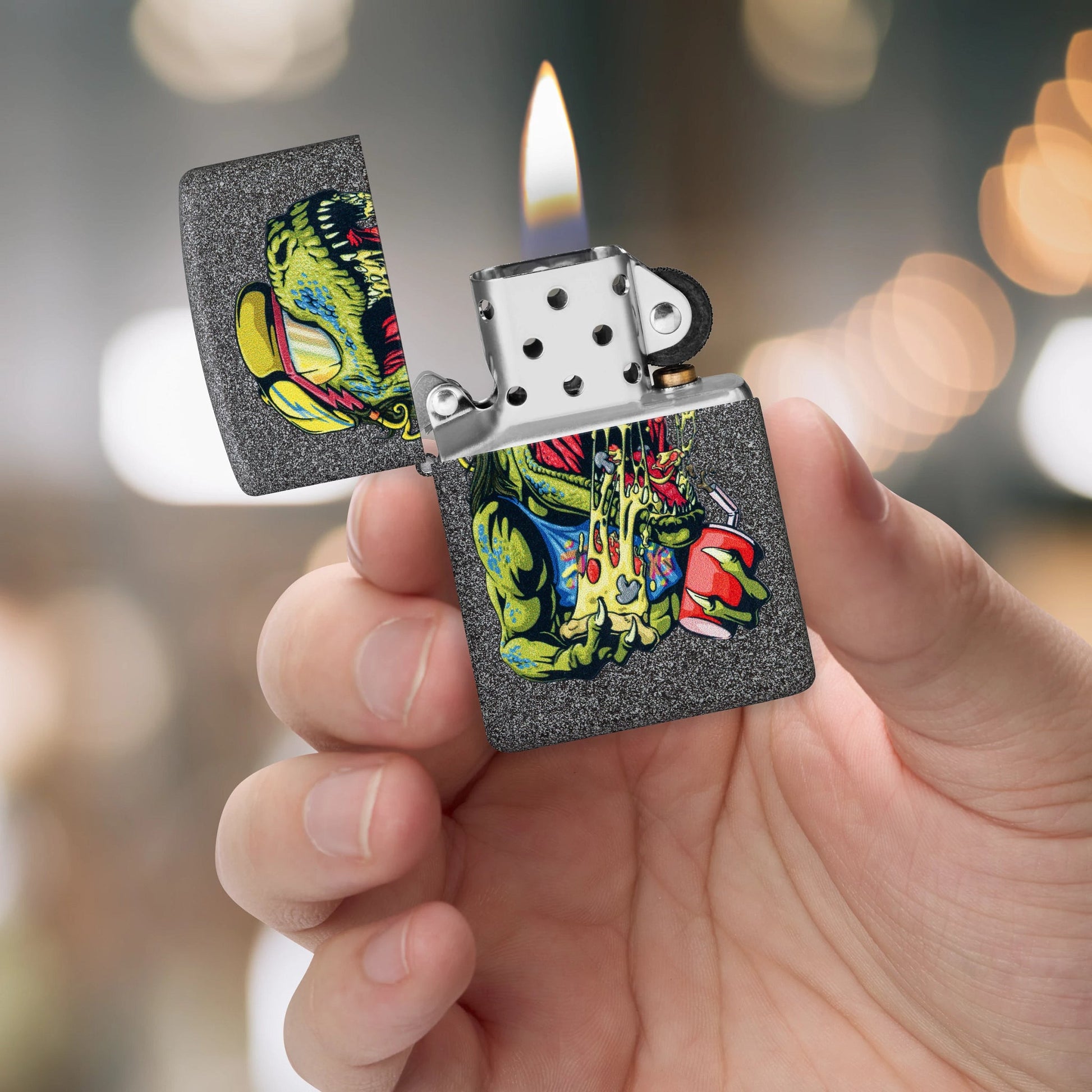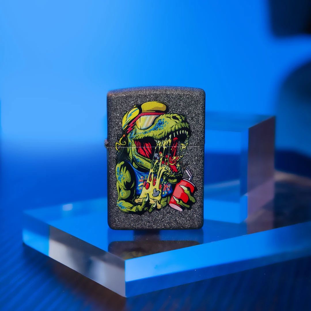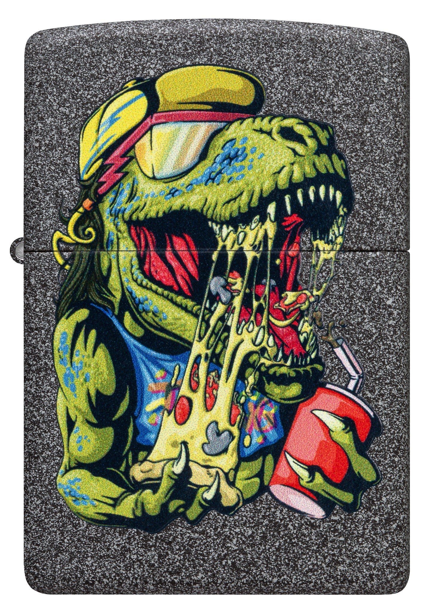 Dig into this gnarly Iron Stone lighter. A totally tubular T-Rex tears into a piece of pizza in the vibrant Color Image design. Comes packaged in a gift box. For optimal performance fill with Zippo lighter fuel.