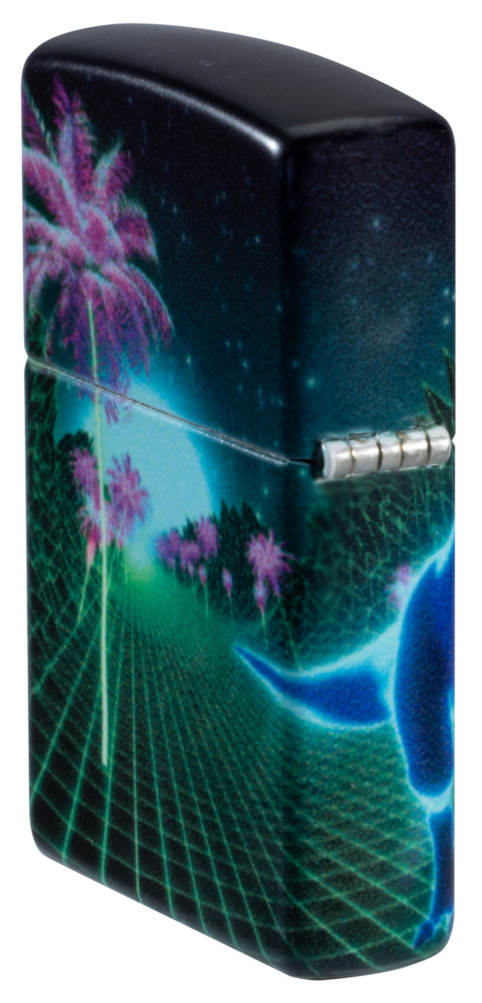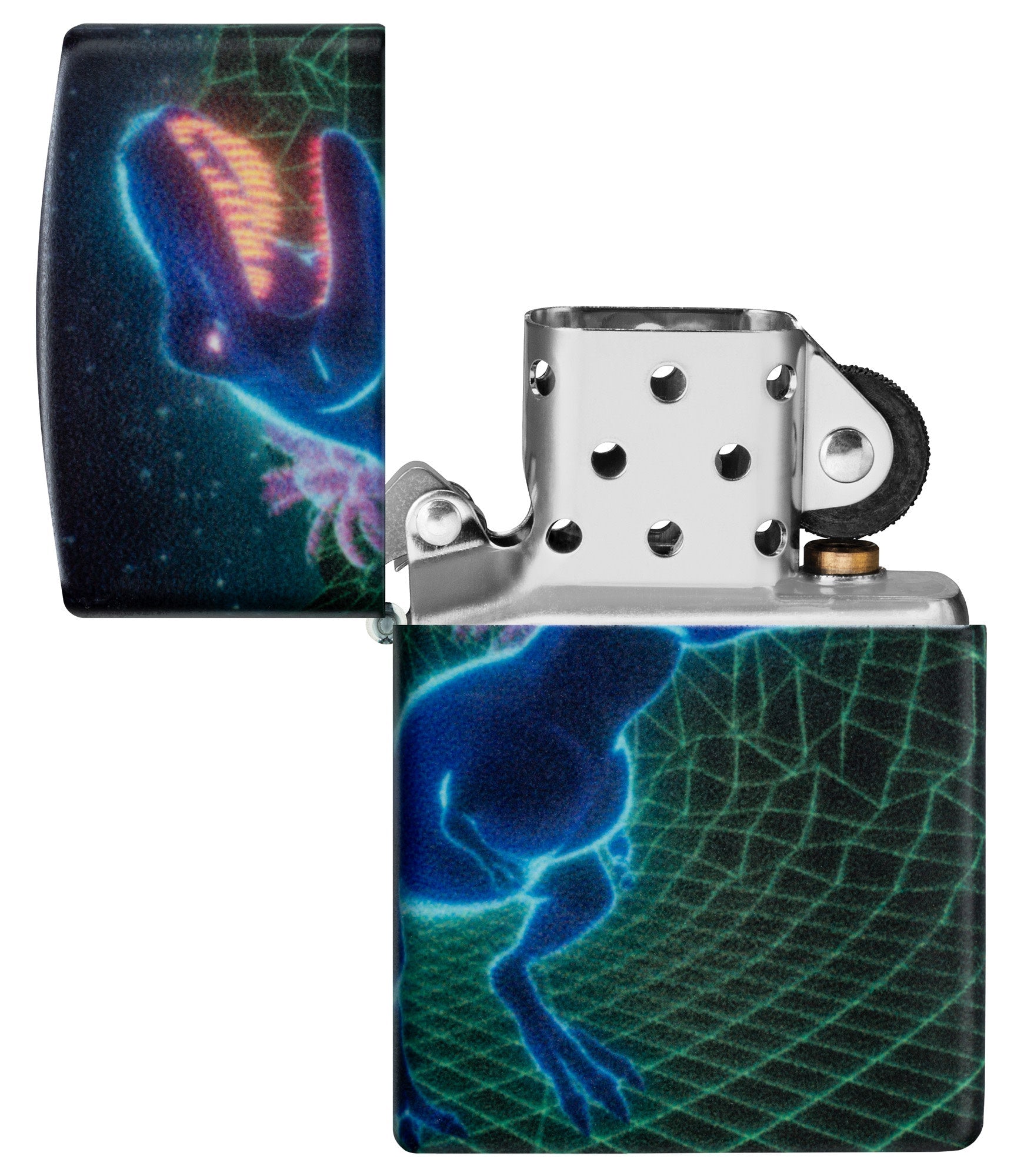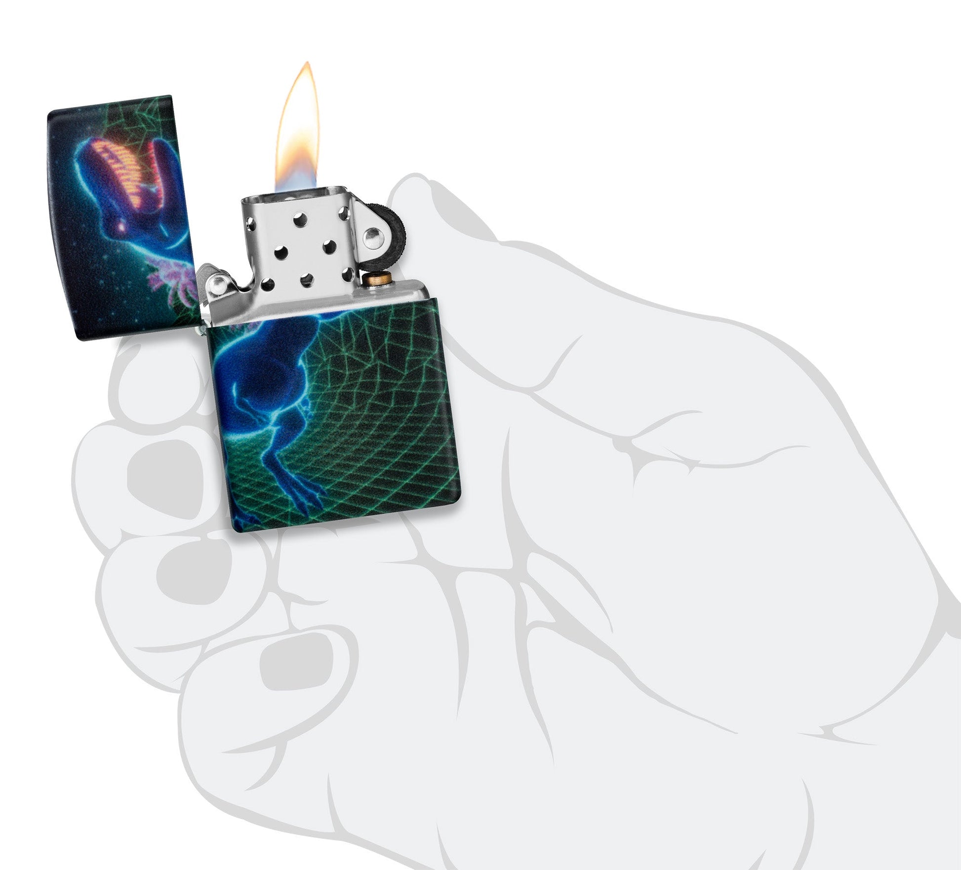 A ferocious dinosaur tears across the surface of this futuristic 540 Color lighter. The entire scene is treated with our Glow-in-the-Dark finish for added interest. Comes packaged in a gift box. For optimal performance fill with Zippo lighter fuel.