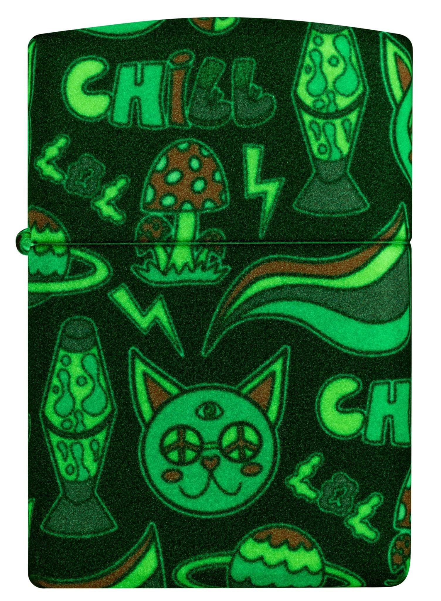 Chill out with this classic 540 Color lighter. Lava lamps, mushrooms and other groovy symbols extend seamlessly around all sides of the lighter, which is treated with our specialty Glow-in-the-Dark finish for added interest. Comes packaged in a gift box. For optimal performance fill with Zippo lighter fuel.