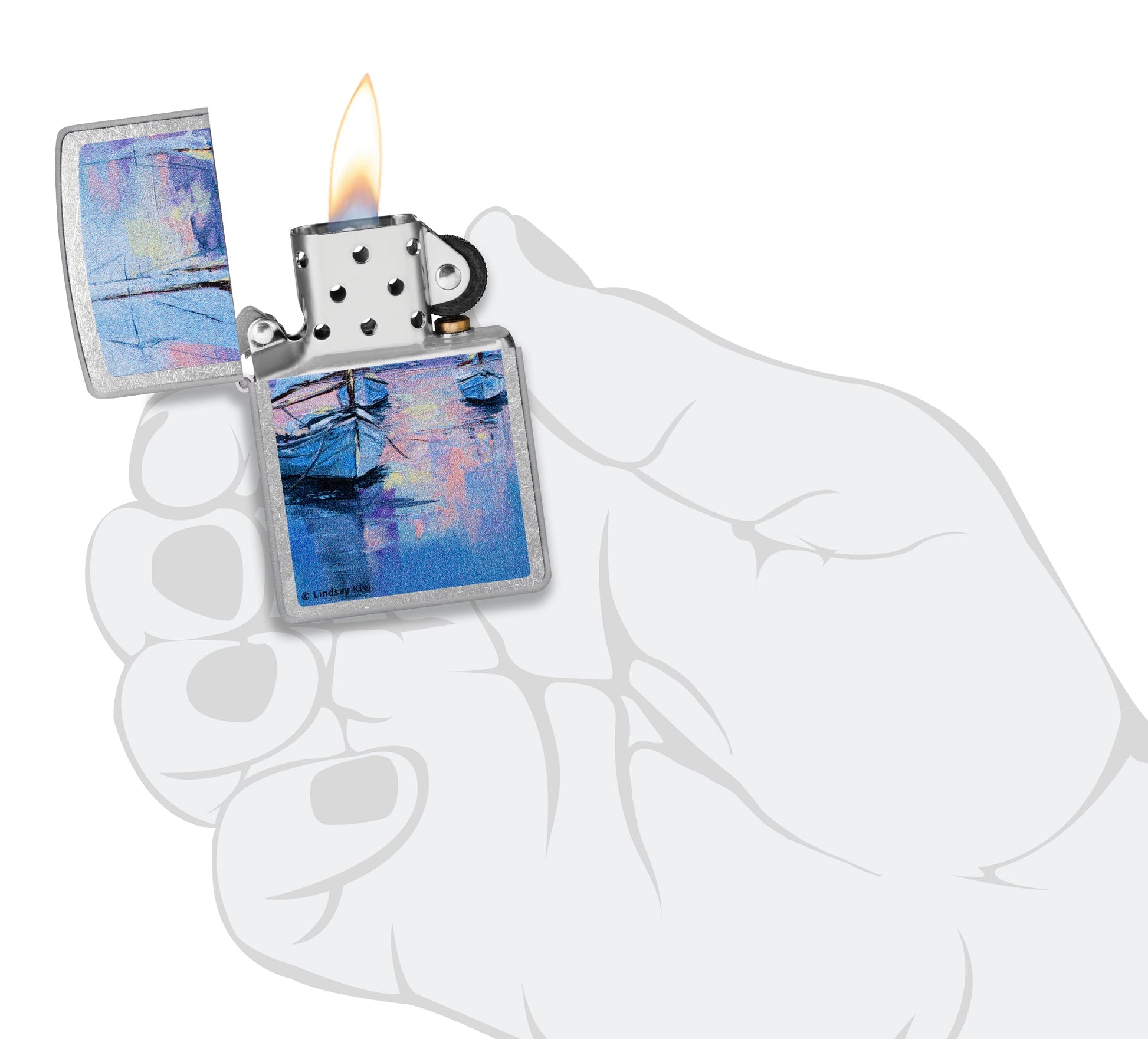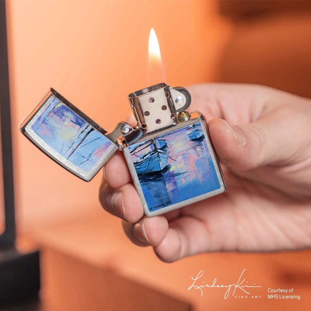 Renowned artist and environmentalist Lindsay Kivi uses her art to affirm our intrinsic link to nature and inspires her audiences to deepen their connection to all living beings. Capturing the beauty of a marina beneath a cotton-candy sunset, her piece, Sailboats, is flawlessly replicated on this classic Street Chrome lighter in a serene Color Image design. Comes packaged in a gift box. For optimal performance fill with Zippo lighter fuel.
