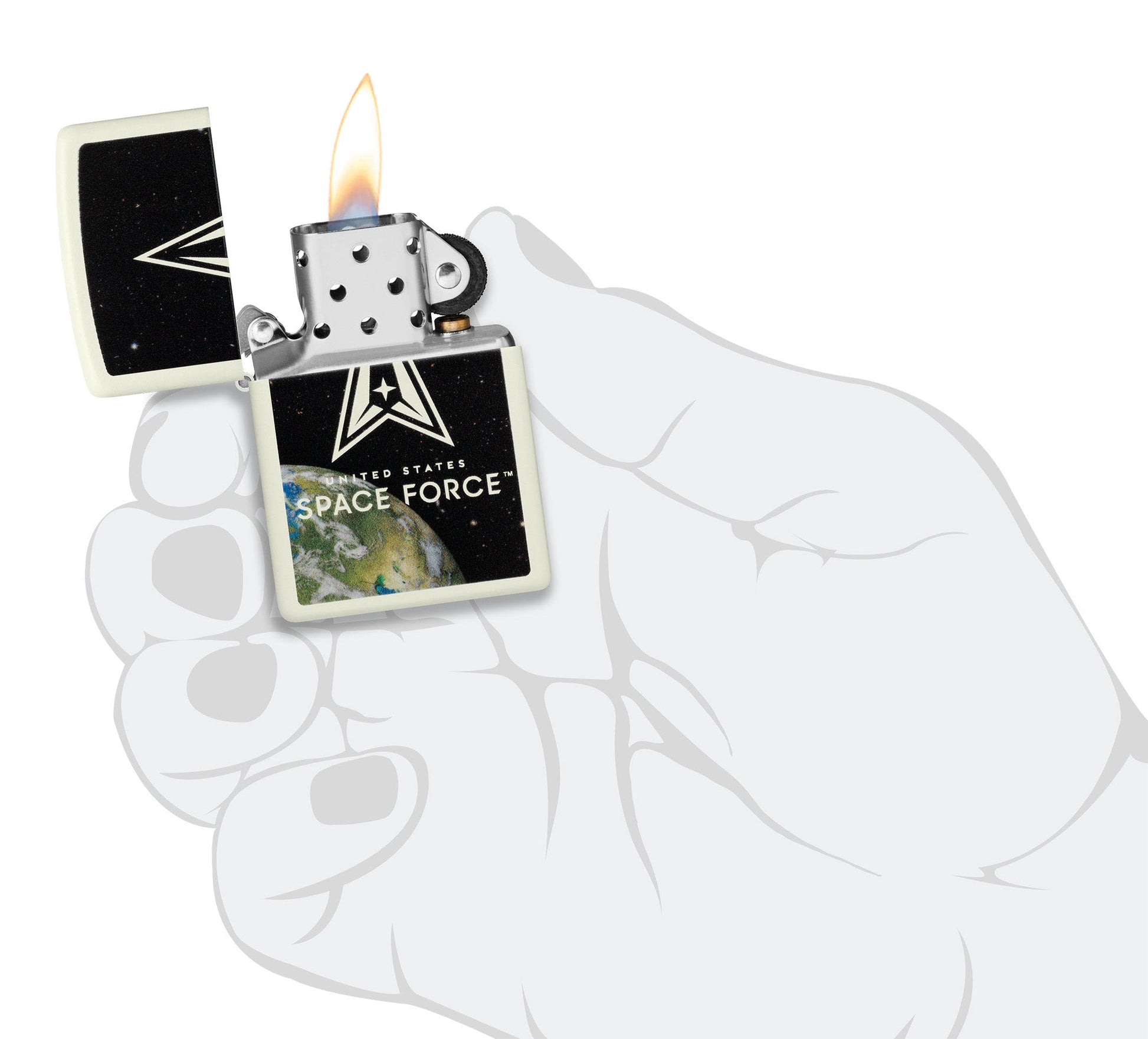 The United States Space Force™ logo appears over a faraway view of Earth on this classic Glow-in-the-Dark lighter in a thrilling Color Image design. Comes packaged in a gift box. For optimal performance fill with Zippo lighter fuel.