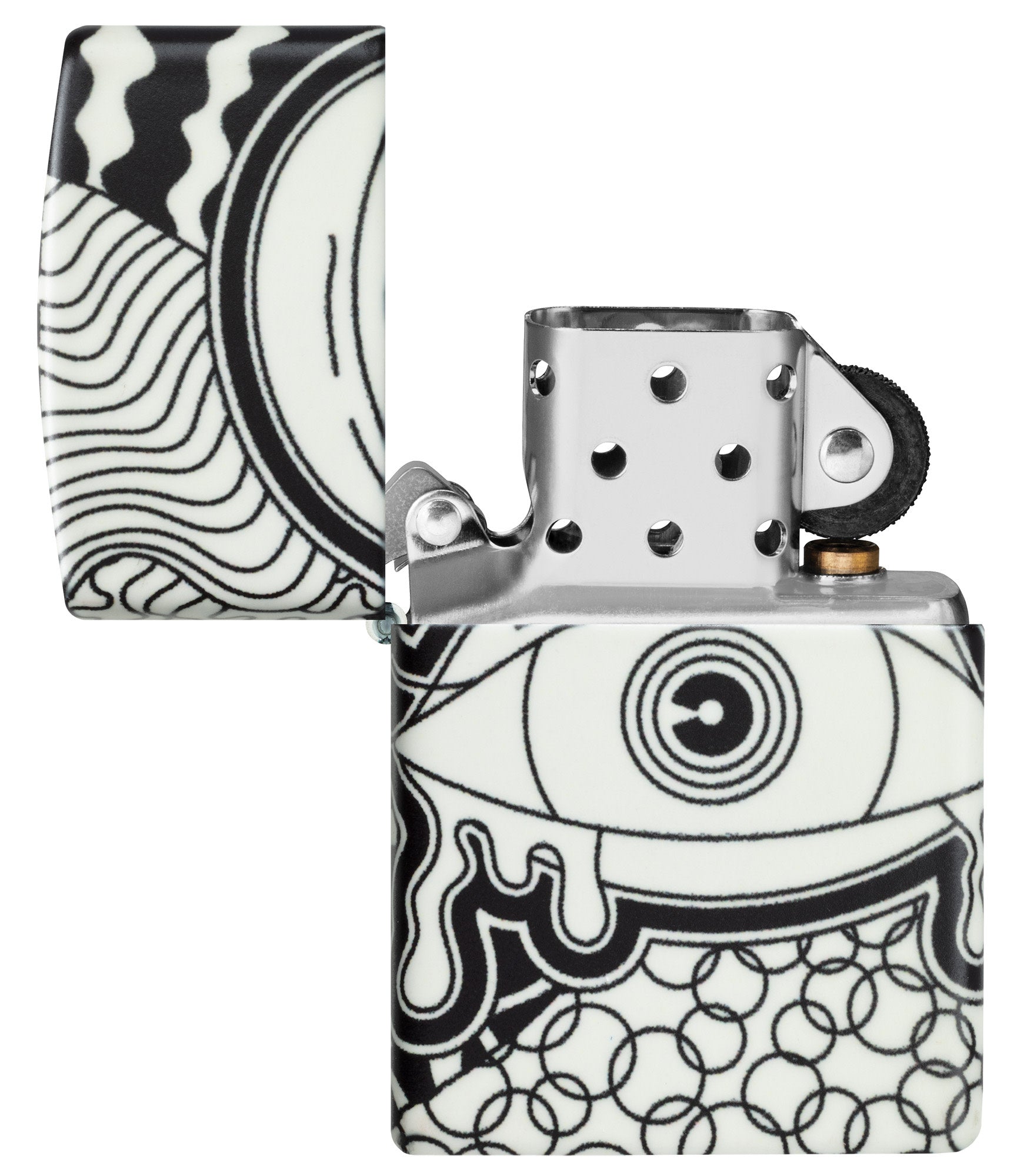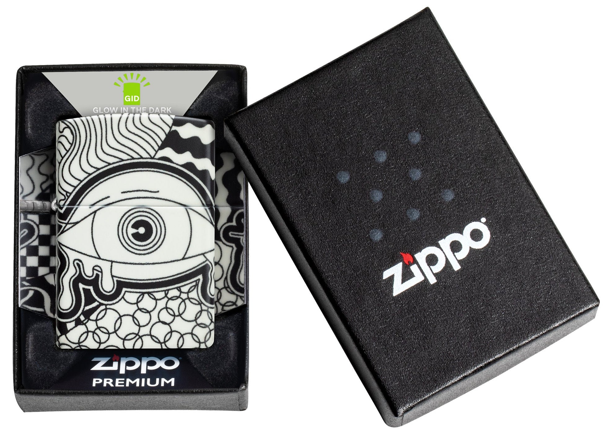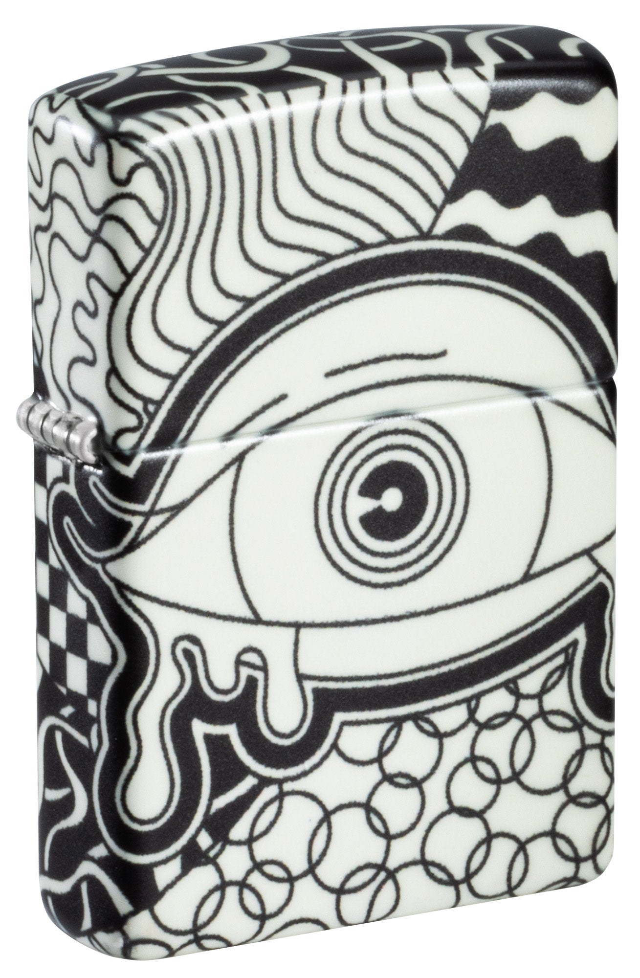 Test your vision on this classic 540 Color lighter. A single eye peers from the front surface, surrounded by dizzying, monochromatic patterns in the all-over design, which glows in the dark thanks to our specialty finish. Comes packaged in a gift box. For optimal performance fill with Zippo lighter fuel.